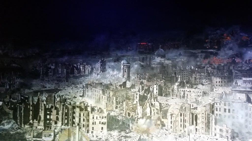 Seit Februar 2015 (bis Mai 2015) wird im so genannten Dresdner Panometer ein Rundum-Panorama der zerstörten Stadt gezeigt. Die Installation gibt annähernd das Bild wieder, das sich am Morgen des 14. Februar 1945 einem fiktiven Betrachter geboten haben muss. In Zeiten, in denen mediale Manipulationen nichts Ungewöhnliches sind, sollte man zwar auch eine bildliche Darstellung von Dresdens historischem Tiefpunkt kritisch betrachten, aber Yadegar Asisi – von dem das Ausstellungskonzept stammt – und seine Mitarbeiter haben sich offensichtlich kundigen Rat eingeholt. Das Panorama und die dazugehörige Ausstellung stellen einen realistischen Eindruck des Kriegsgeschehens dar. Dass der Eine oder Andere vielleicht glaubt, manche Details müssten in einer anderen Weise dargestellt werden, ist bei dieser Thematik nicht anders zu erwarten.
